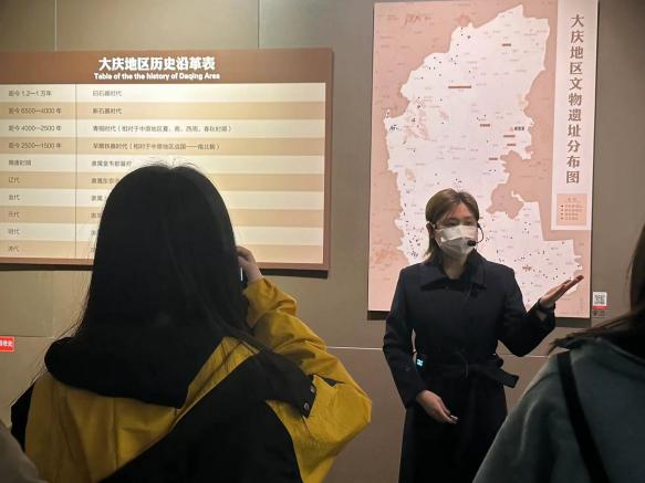在此次专业实践学习活动中,全体成员一早便乘车前往大庆博物馆,与馆内负责老师沟通对接,听从馆内工作人员安排,并在讲解员的带领下开启参观之旅。成员们通过时间隧道,穿越历史长河,欣赏大庆远古自然雄伟瑰丽的景象,感受第四纪哺乳动物群的庞大气势。融入古人类“依丘岗为猎,傍河水而渔”的悠然情境,赏析悠悠岁月珍藏已久的历史文化遗存,感叹东北第四纪的博大精深和大庆地区古代人类文明的永恒魅力,感受大庆文化的多元与独特,寻找“黑土地”穿越古今的前世今生,共同领略大庆这座新兴城市的历史风华和蓬勃生机。