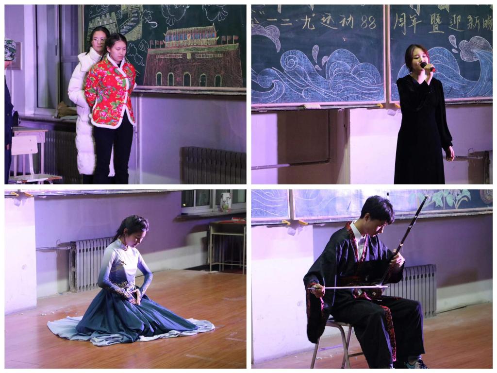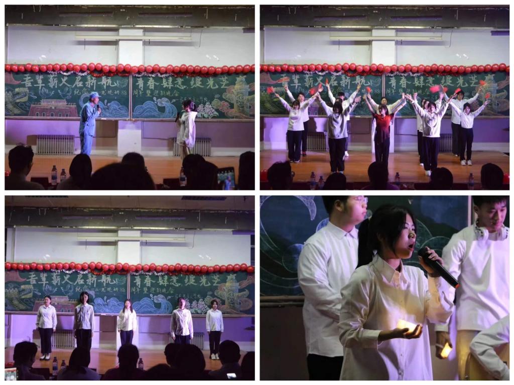由乐天使主席团成员、员工骨干集体演唱的《星辰大海》将晚会激情点燃。情景剧《亮剑》以细腻的表演充分展现红旗飘飘,军号响,剑已出鞘,雷鸣电闪!舞蹈《日不落》愿世界一切的美好,永远是旭日东升,永远的日不落。歌曲《天下无双》带来的是爱横亘千古,是爱举世无双。在独舞《乌兰巴托的夜》中感受寂静与力量的交织,共同寻找着内心的方向,感受着生命的脉动。秦筝吐绝调,玉柱扬清曲,一曲二胡演奏《兰亭序》带大家体会中华文化的源远流长、博大精深。情景剧《这盛世如你所愿》以穿越对话的形式带大家回到那个硝烟弥漫的年代,一同看那个崭新的中国。英雄是民族最闪亮的坐标,手语《追光者》带领大家一起致敬所有为党和人民的伟大事业捐躯的英烈们。这是一次关于2023年的温暖回望,送给所有一起走过2023年的人。吉他合唱《星星在唱歌》让大家一同告别旧时光,拥抱每一个温柔又闪亮的日子。许下青春的誓言,见证未来的绽放,坚定的目光、滚烫的初心,每一位马院青年用铿锵誓言诉说着“青春无悔”,誓言回响在教室、激荡在每一个人的心中。晚会在“强国有我 青春担当”的声声感召下落下帷幕。