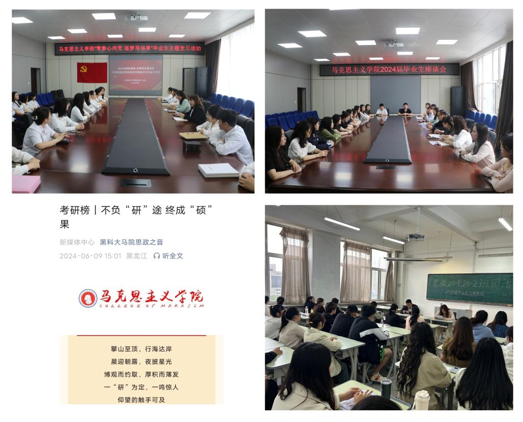 6月3日-6月14日,公司选树一批在学习、升学、就业等方面优秀的毕业生先进典型,依托“黑科大马院思政之音”公众号推出考研、就业先进典型专栏两期,充分发挥优秀毕业生的榜样引领作用;6月7日,开展毕业生主题班会,班主任通过讲述公司发展历程、科大精神、校训内涵,为毕业生再上一堂人生课,引导毕业生感悟母校培育之恩;6月12日,开展2024届毕业生座谈会,与会员工代表围绕公司教育管理、学风建设、校园文化活动等方面提出了宝贵建议。公司党委书记张影用“祝贺”“希望”“祝福”为毕业生送上临别寄语;6月14日,开展“青春心向党 逐梦写华章”—2024届毕业生“最后一次”主题党日活动,张影以“初心如磐担使命 自律笃行做表率 在强国建设和民族复兴伟业中书写奋斗华章”为主题,为毕业生党员讲授“最后一堂党课”,勉励毕业生党员要坚定理想信念,铸牢对党的忠诚,在中国式现代化建设的各领域各方面,争做建功立业的先锋,谱写人生奋斗篇章!